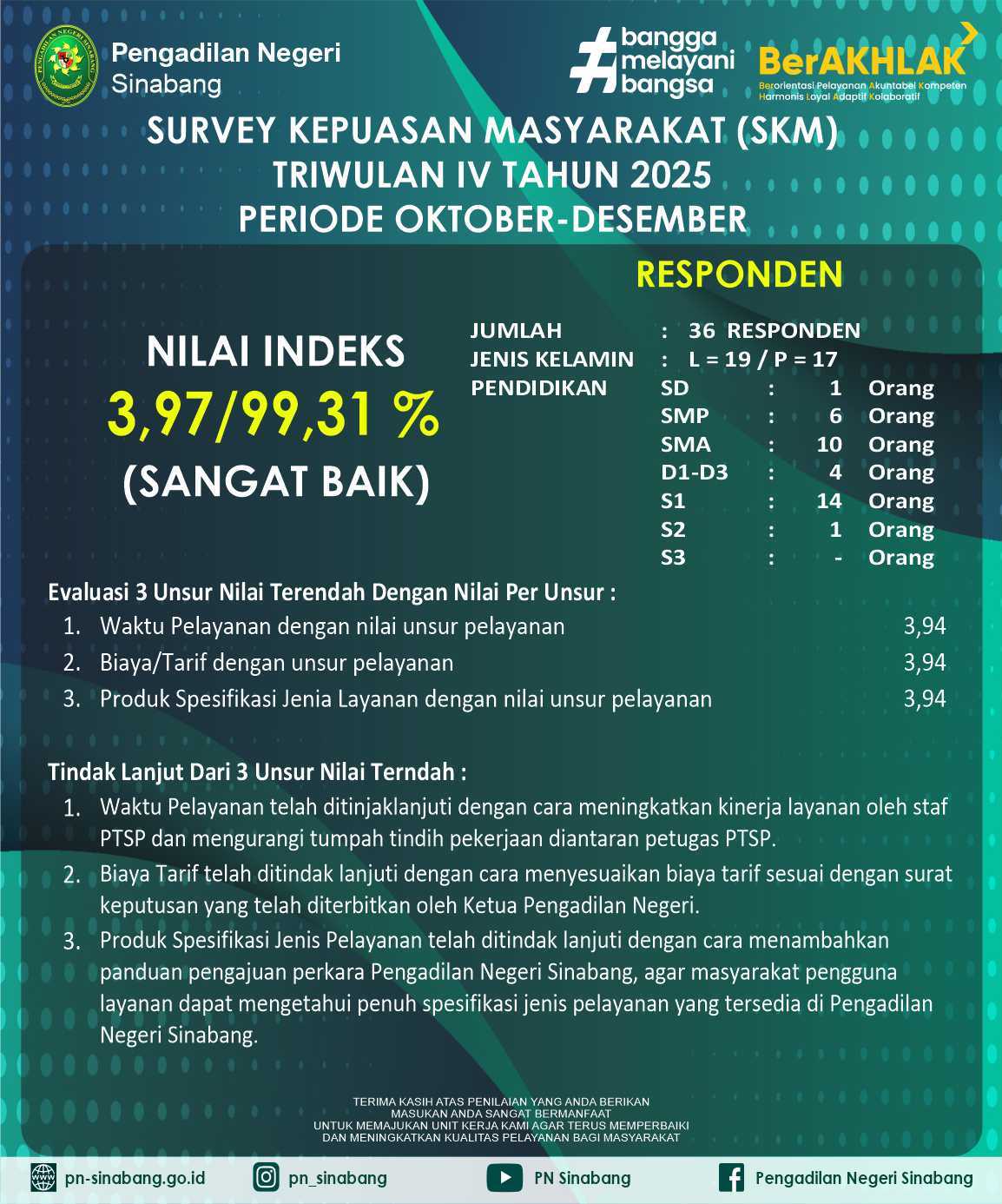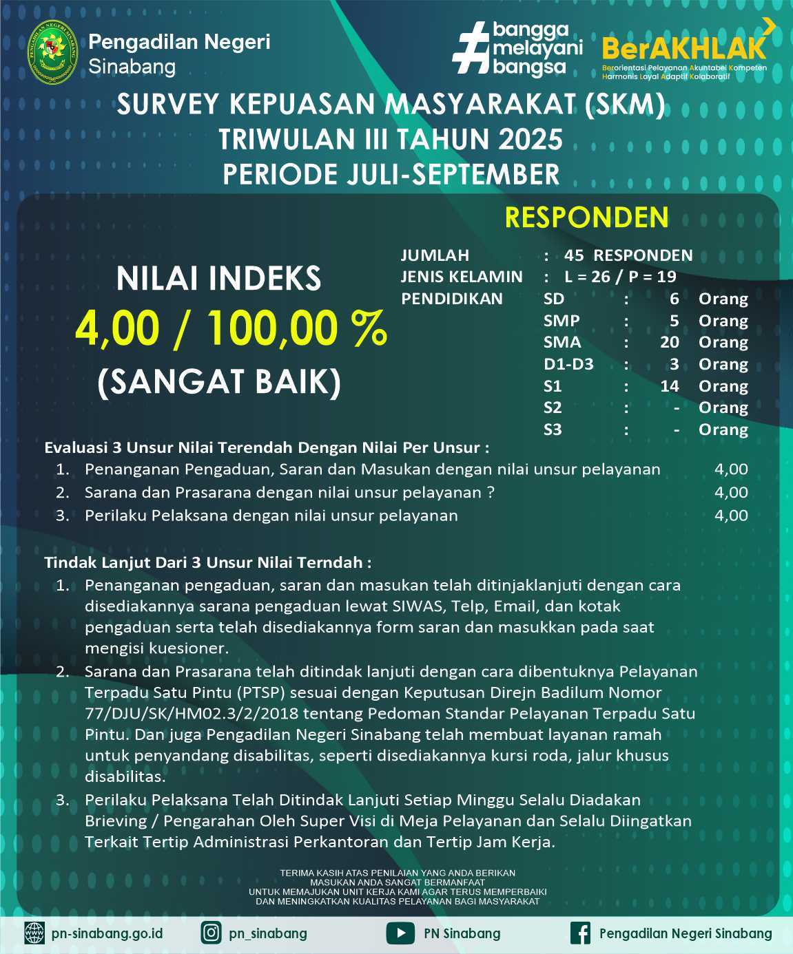 Berikut hasil survey Indeks Kepuasan Masyarakat yang diselenggarakan Pengadilan Negeri Sinabang.