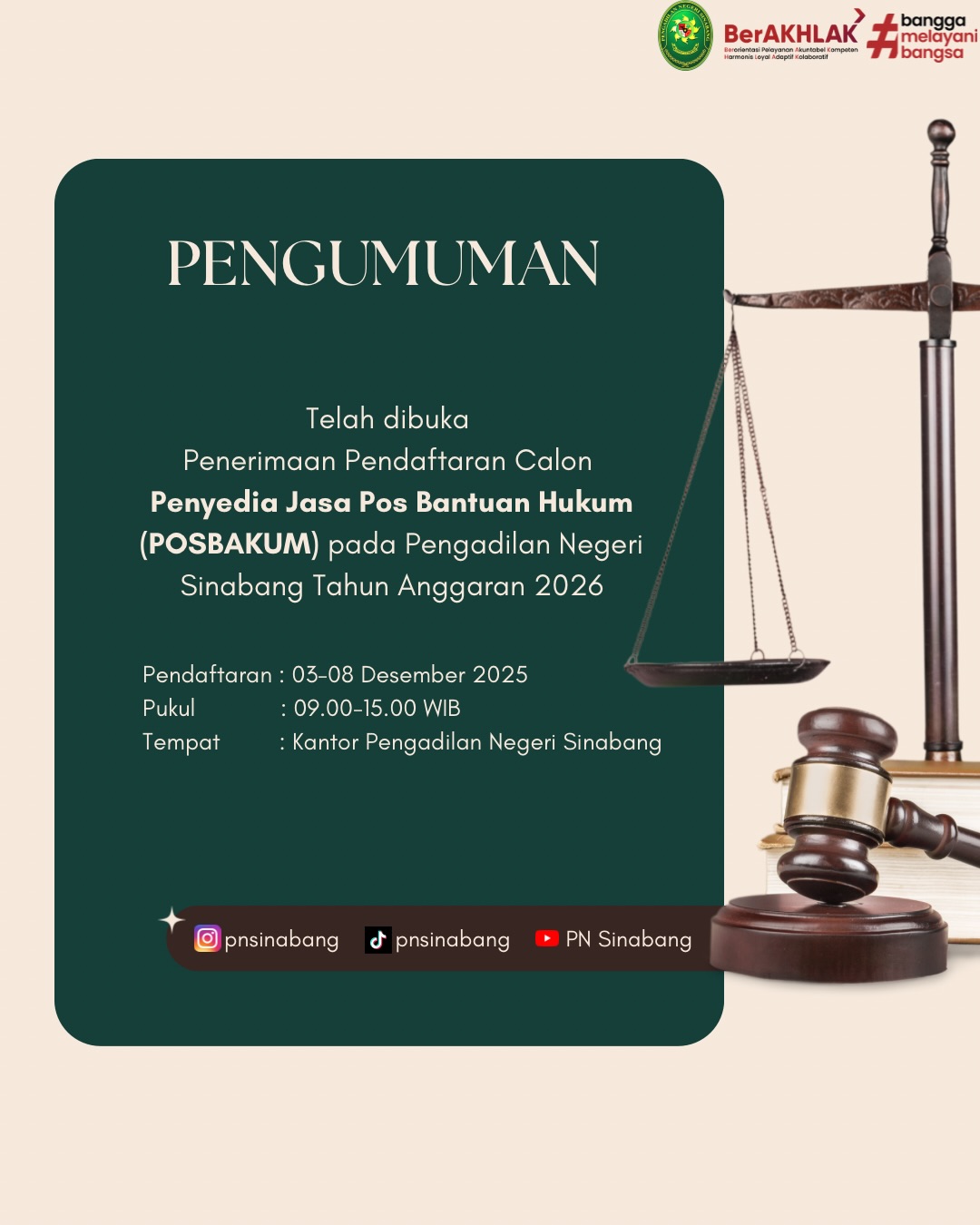 Sinabang-Humas: Pengadilan Negeri Sinabang membuka Seleksi Lembaga Pemberi Layanan Pos Bantuan Hukum (POSBAKUM) Tahun Anggaran 2026 sebagai bagian dari peningkatan akses bantuan hukum .......