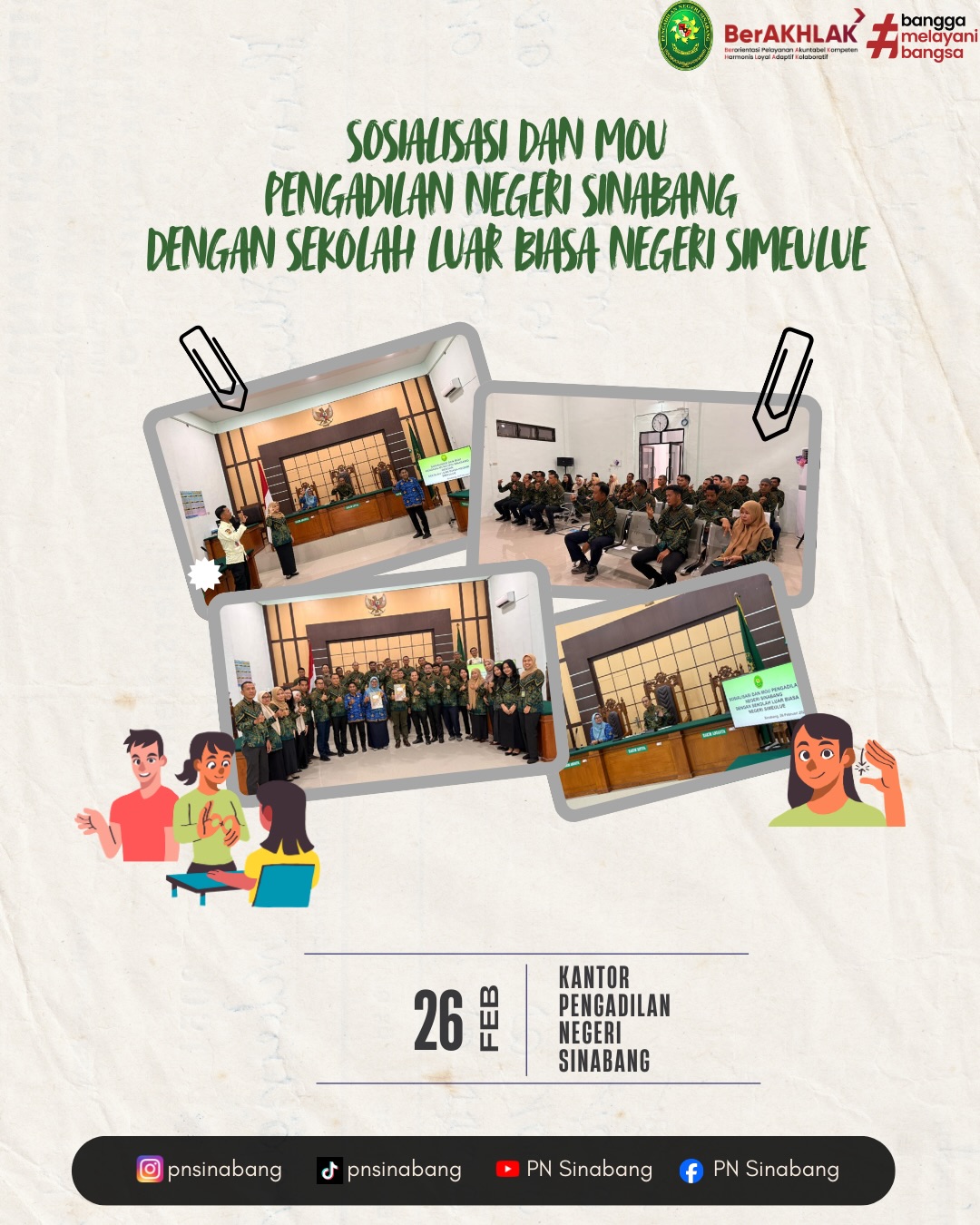 Sosialisasi dan Penandatanganan Nota Kesepahaman (MoU) antara Pengadilan Negeri Sinabang dengan Sekolah Luar Biasa Negeri Simeulue tentang Praktik Bahasa Isyarat serta Kerja Sama dalam Penyediaan Layanan bagi Penyandang Disabilitas di Kantor Pengadilan Negeri Sinabang.