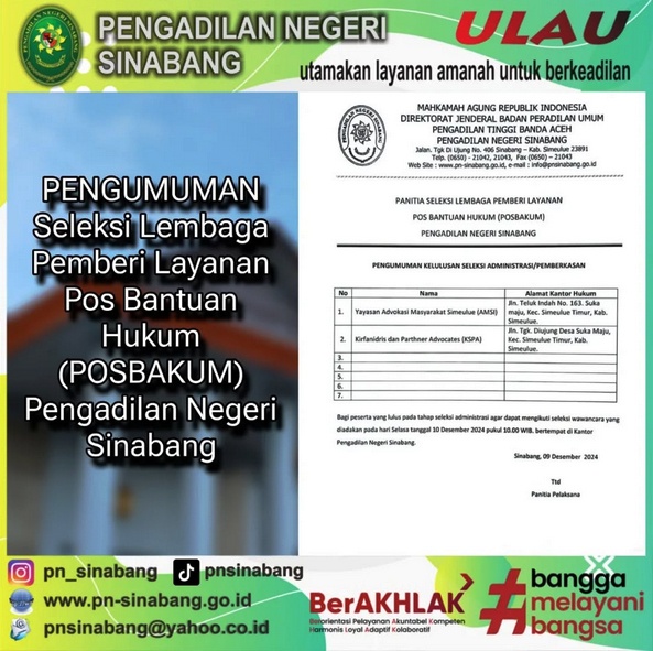Pengumuman Hasil Seleksi Administrasi POSBAKUM pada Pengadilan Negeri Sinabang.